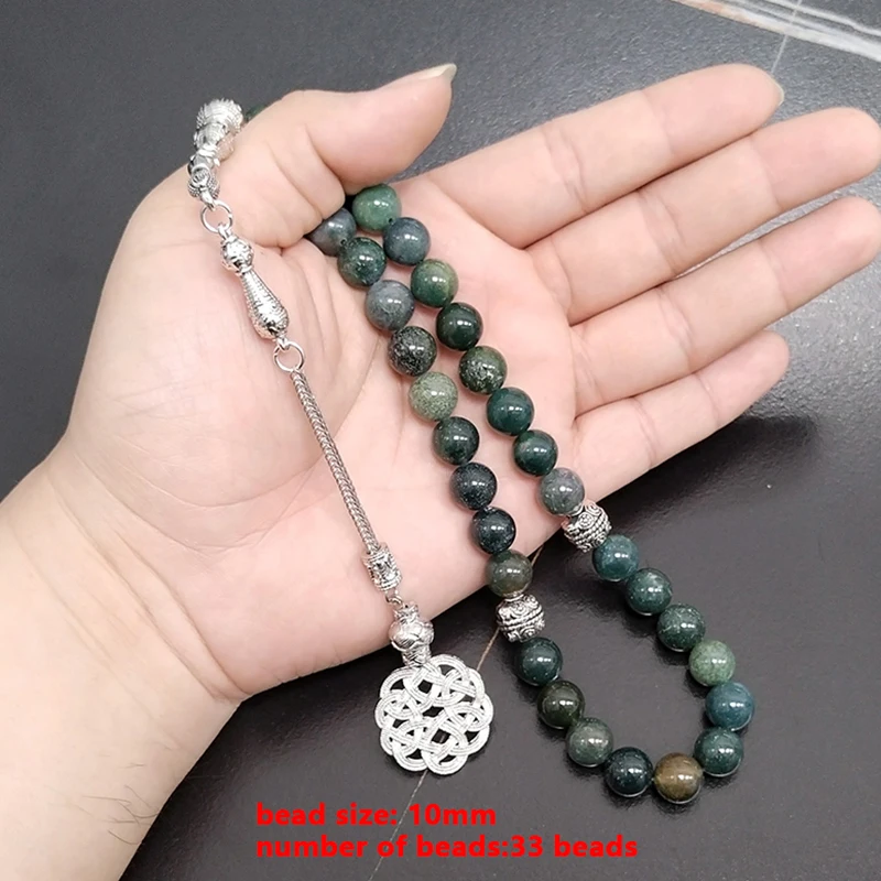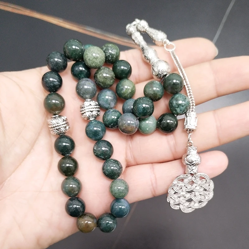تفاصيل تسبيح حبات المواد: عقيق عشبي طبيعي شرابة المواد: معدن وزن التسبيح: 66 جرام حبات العرض: 10 + طول تسبيح + شرابة: 35  ..